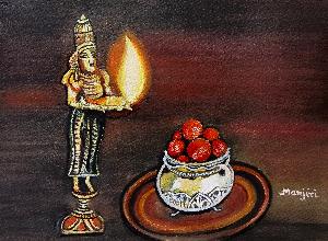 Diwali Art With Oil Lamp And Gulab Jamun - Art