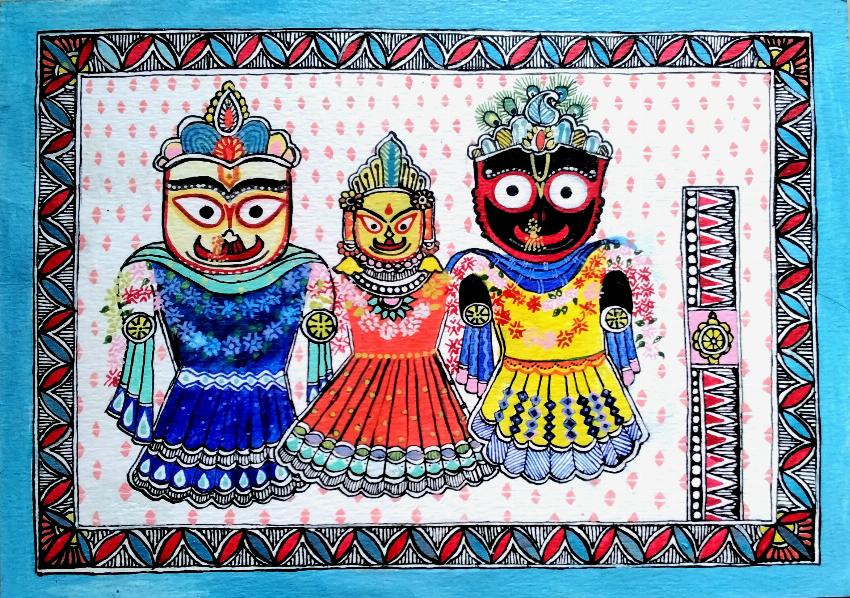 Painting of JagannathJi, Subhadra and Balbhadra ji. This painting is made on a handmade sheet with nib in acrylic colors. Size of the sheet is A5.