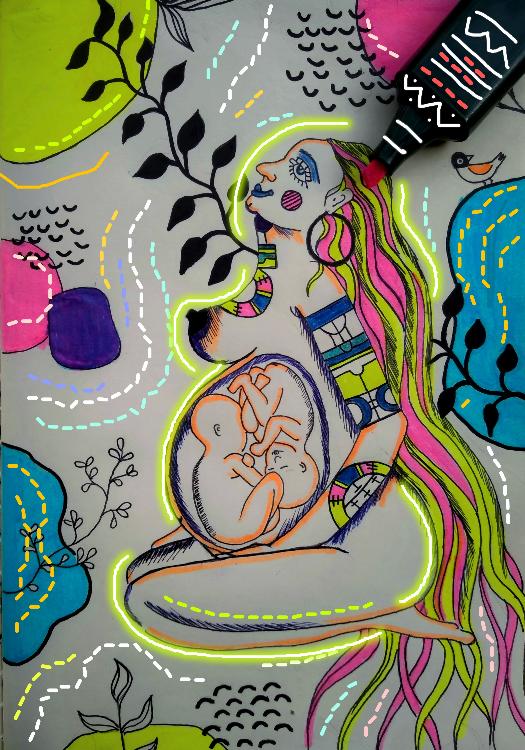 Janani(mother) carry twins inside her womb. . . . Hand-illustration on art paper with fusion effects Of digital elements.
