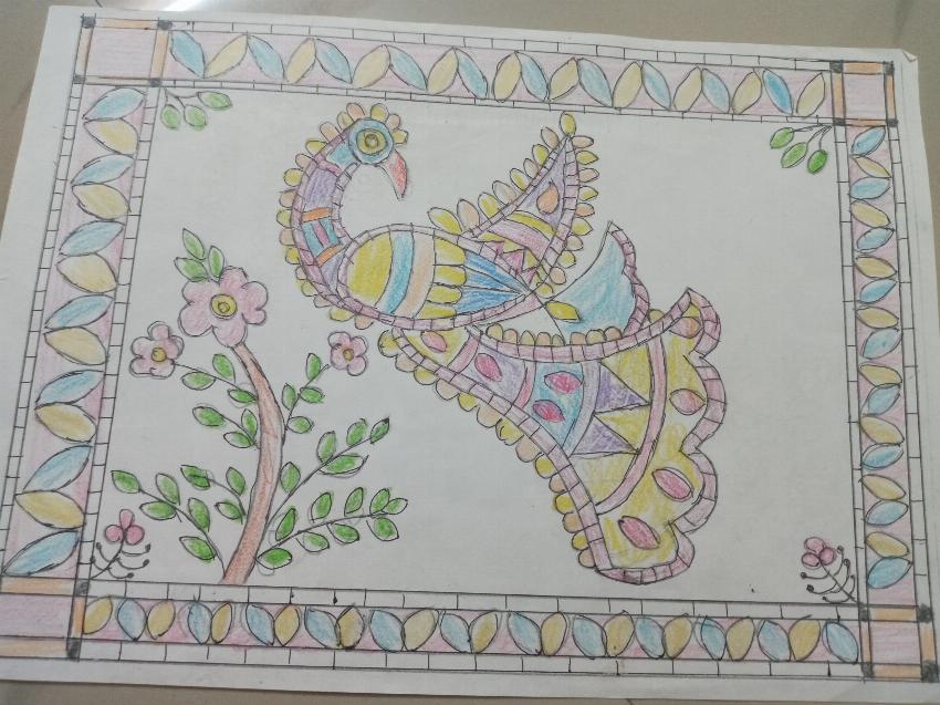 Madhubani art with pen and colour pencils