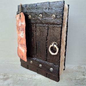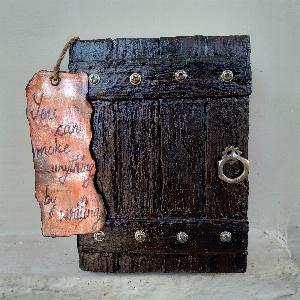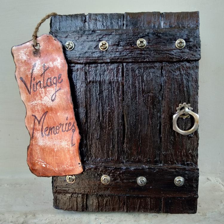 It is a handmade vintage dairy. It is made of paper. First I converted the A4 sheet to vintage paper with tea water. Then attached these pages with thread and glue. Its cover was made by cardboard, putting putty and glue paste on the cardboard to give it a wooden look. Then paint it and for better protection I used varnish, used some screws and waser to give it a vintage look.