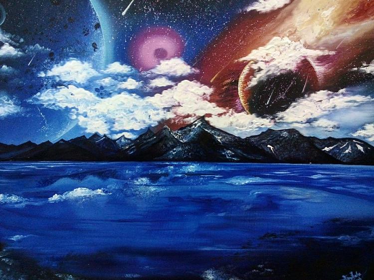 Landscape painting Size - 18x24 inches Medium - Oil colour on canvas board Description - The painting represents a vibrant colour scheme artwork portraying a unique landscape of defining the beauty of being the different. One side of landscape consists of blue hues whereas other side has orange with red hues. The fire and coolness blended in the same canvas. The water seem calm.