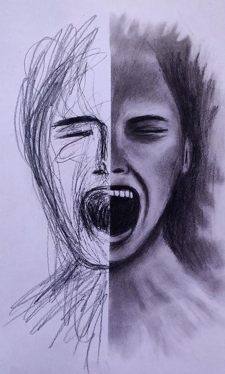 It's a charcoal art. In this art you can see the pain, feeling, sadness inside her, it's a scramble charcoal artwork
