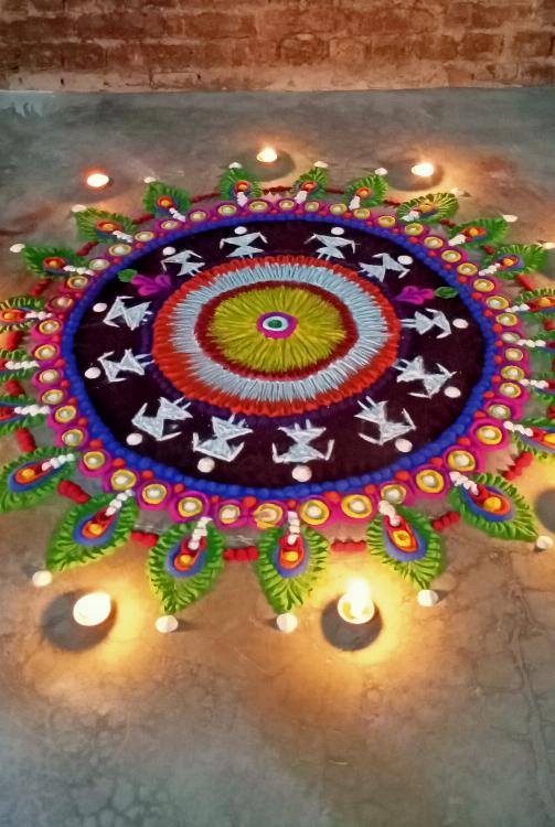 This is the rangoli which i made on Diwali.It has various elements which depict various meanings.The colours used are intentionally chosen bright to create a positive feel. He peacock feathers are the symbol of beauty and enchantment.The warli art symbolises harmony among ppl.And ofcourse the colours say it all.