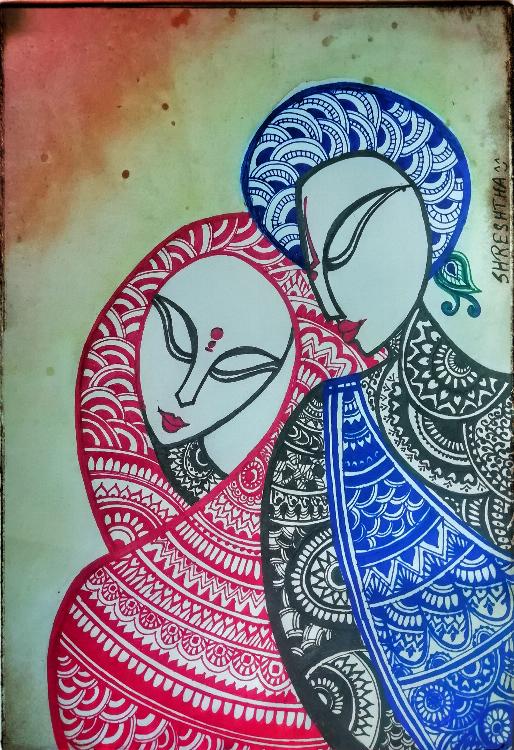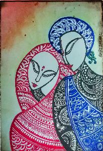 This piece of art portrays Lord Krishna and Radha engrossed in each other's love. The love which is so serene and captivating that they become unaware of the worldly things around them. Different colours has been used in this mandala painting to denote the vibrancy of love as to show that love adds colour to our life and brings back beauty in everything around us. Minute detailing has been done here. "To love and to be loved is the best feeling in this world" is denoted by this art.