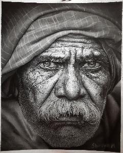 This is a portrait of an old Indian man. A3 ivory sheet Medium : Graphite