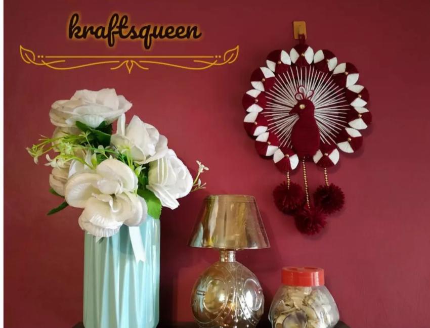Peacock wall hanging using woolen thread and cardboard