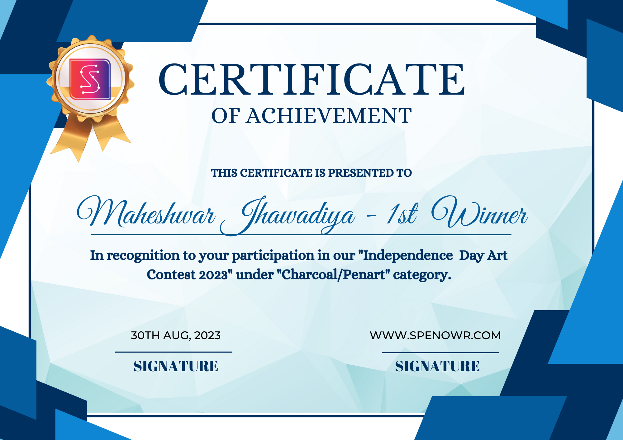 Wins 1st position in the Charcoal/Penart category.