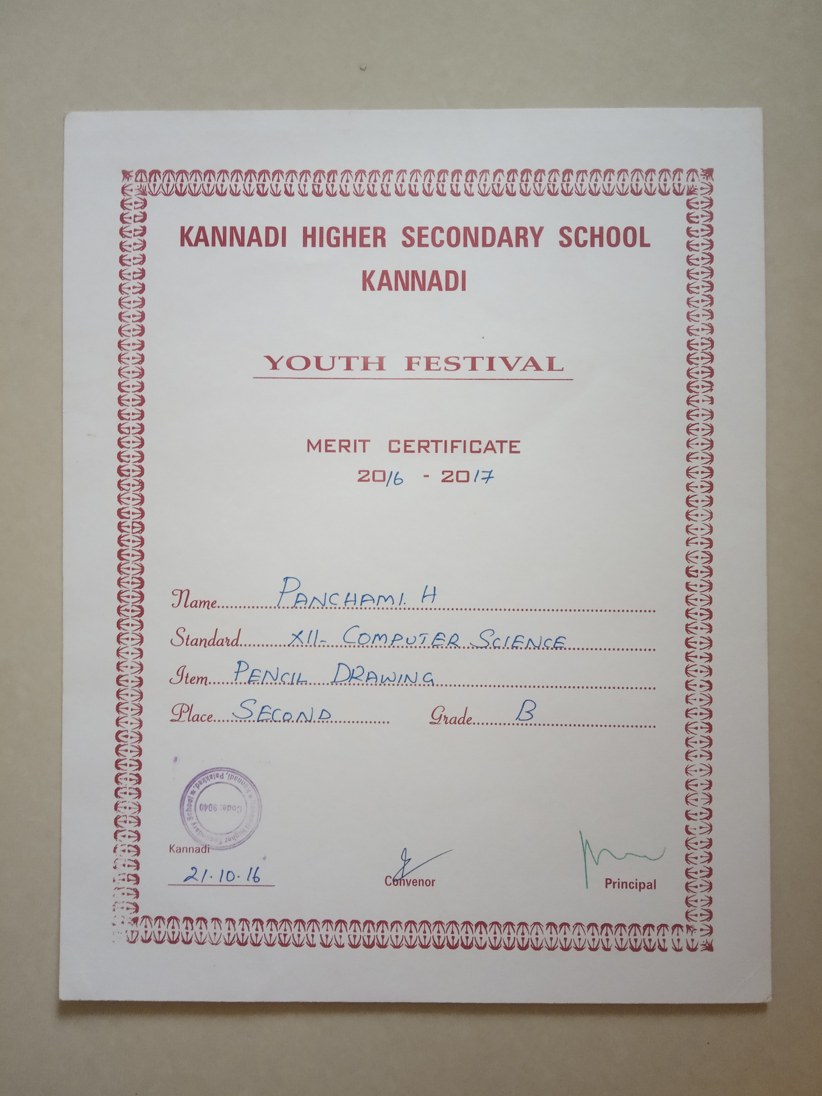 This certificate for winning 2nd with B grade in PENCIL DRAWING.