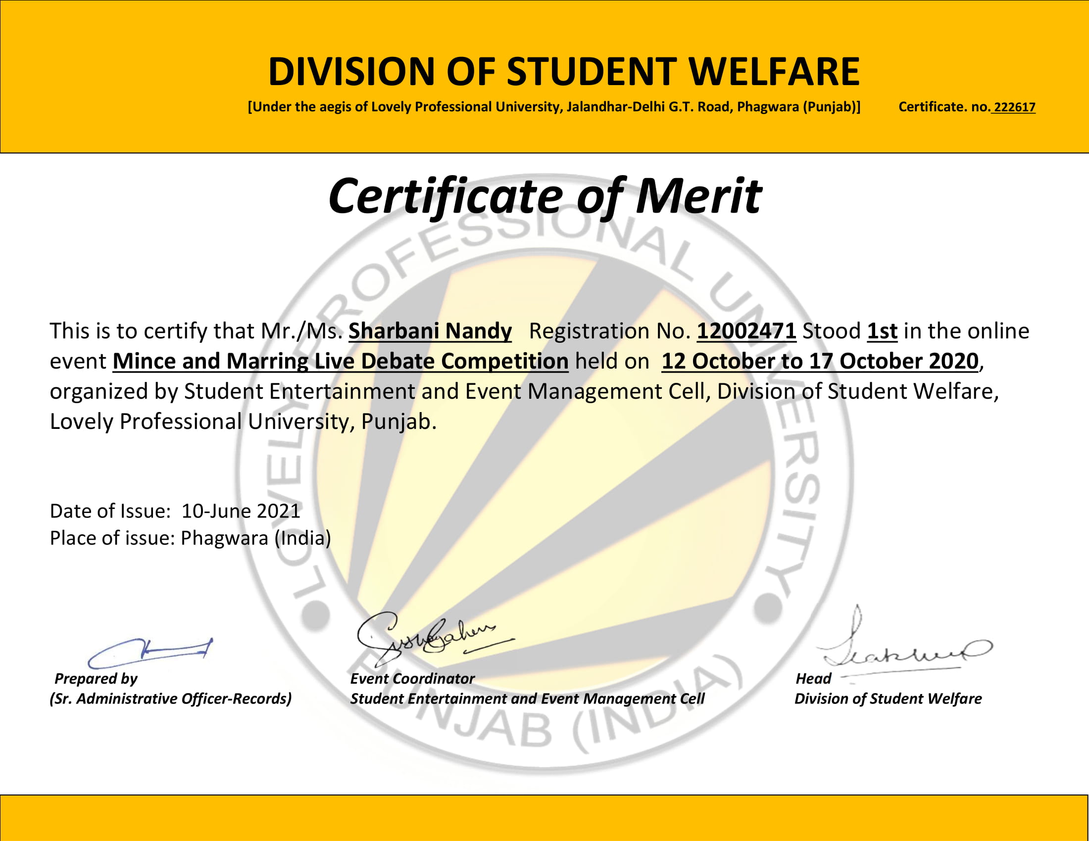 This was a University Level Debate Competition that was held in online mode in Lovely Professional University, Jalandhar. I stood first in the Debate Competition showcasing my speech fluency, my points and my overall presentation.