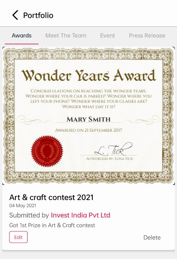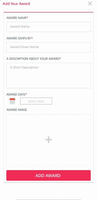 By clicking on ‘Portfolio’, you will come across a module written ‘Award’, by clicking on ‘+’ you will find these empty fields, where you can add your awards by adding the content and details about it.