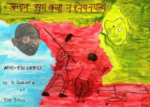 Its an analogy between Gandhiji and Buddha on nonviolence. It includes a quote from Gandhiji and a preaching of Buddha from the Dandabhaggo, written in devnagari script.