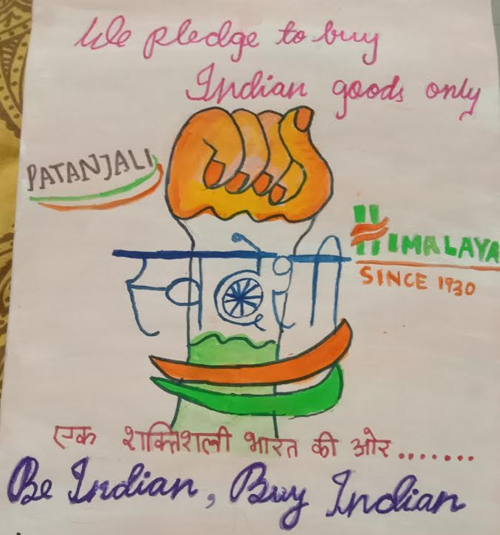 This artwork portrays the need of buying Indian goods only (SWADESHI) in order to make our country self-reliant. MEDIUM- Poster colours; A4 size paper used.