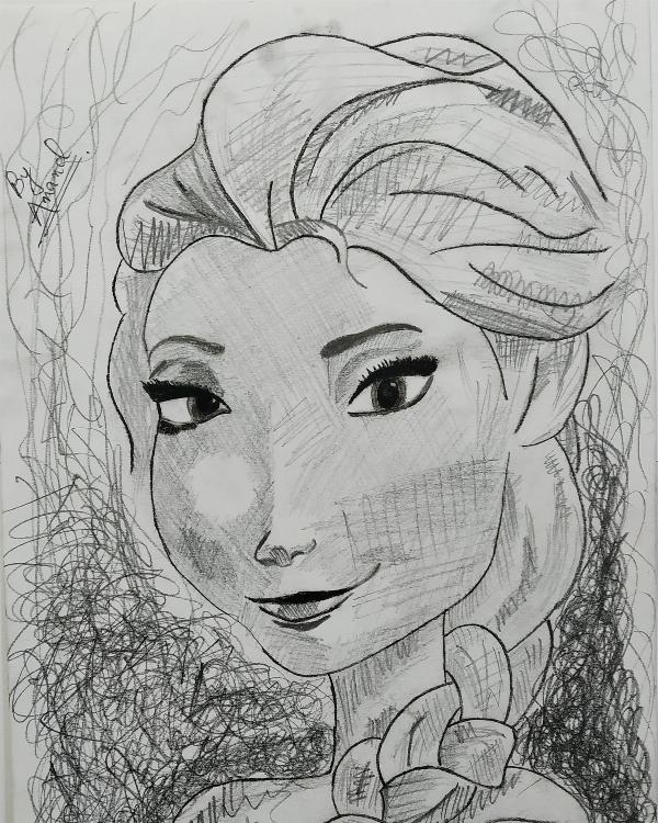 Pencil sketch of animated character named Elsa
