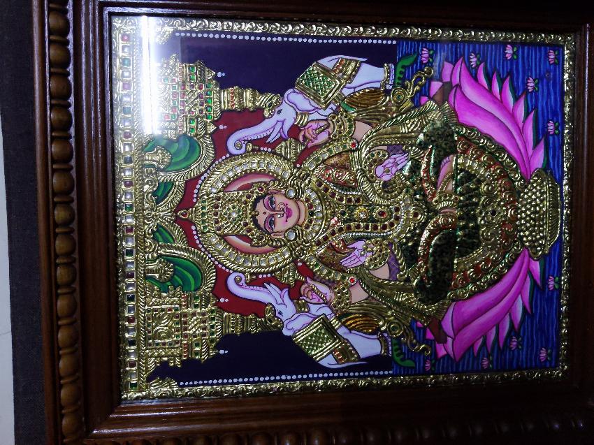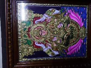 Hindu God pictures done with Moderate relief works done on prepared termite resistant wooden board using special muck paste and 22 karat gold leaves, coloring done with poster colours enhanced with jaipur stones.