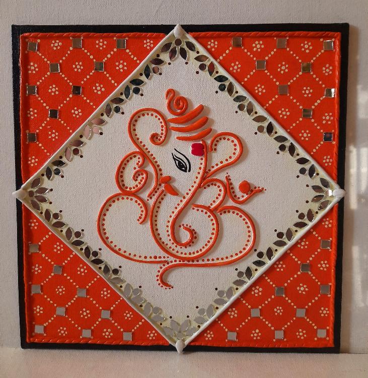 Ganesha in Lippan Art on 10" square canvas board Auspicious and beautiful painting of Lord Ganesh made in lippan style. A must have for homes and offices; brings prosperity and good fortune. Size:10"×10" Material: Acrylic paints on canvas board, with clay and mirror work. Type: wall hanging * Canvas board base * Colour combination: orange and white * Embossed work with clay and mirrors * Vibrant and bright * Ready to hang on wall (hook attached at the back for ease of hanging) * No framing required * H
