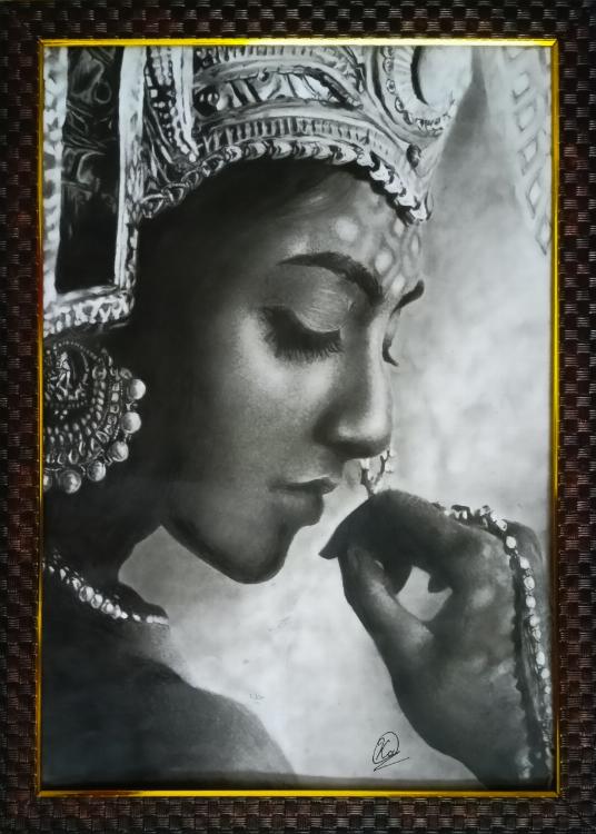 Iys an charcoal artwork on an A3 sheet of paper it took me more than 60 hours. It is an ultra realistic potrait. It is so detailed that if you zoom the photo you will be able to even see small pores of the skin.
