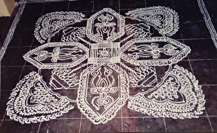 This is a traditional Kolam drawn with riceflour paste.