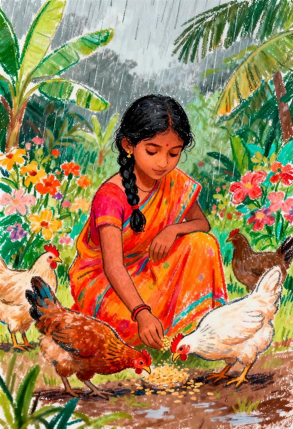 This evocative artwork captures a serene rural moment where a young girl, dressed in a vibrant traditional sari, gently feeds grains to chickens amid a lush, rain-soaked garden. Soft streaks of falling rain blend with rich greens of banana leaves and blooming flowers, creating a soothing monsoon atmosphere. The girl’s calm expression and delicate gesture reflect compassion, innocence, and a deep connection with nature and everyday village life.