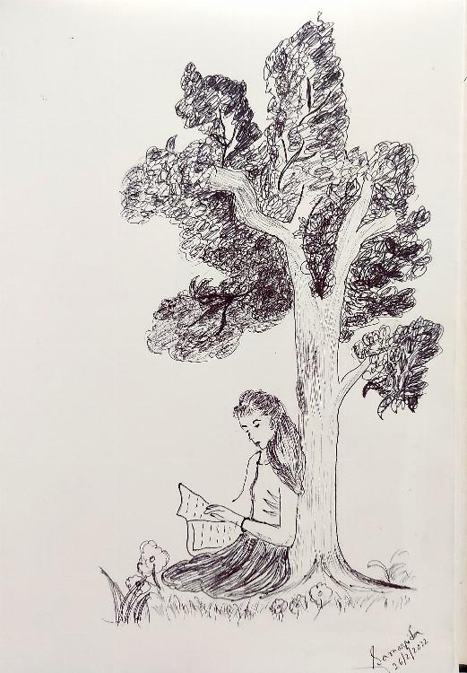 This is a black ball pen drawing from imagination where a girl enjoying reading under a tree.
