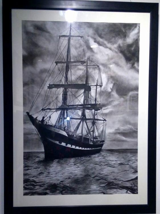 The seascape painting represents a ship sailing in the sea. It portrays a nearly realistic approach of the sea water and the raft. The stormy dramatic weather is creating an obstacle in its path.