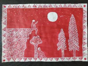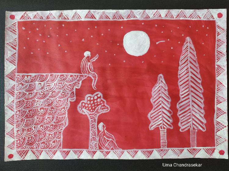 This is an Aipan art, very famous in Kumaon region of Uttarakhand. Using their traditional technique of setting up a base in red and drawing over it white, I have created this innovative Aipan, wherein two boys oblivious of the other's presence is watching a shooting star and admiring the tranquility of the moon.