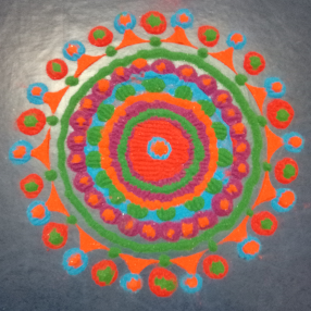 Rangoli is an art form, originating in the Indian subcontinent, in which patterns are created on the floor or the ground using materials such as coloured rice, coloured sand, quartz powder or flower petals. ... The purpose of rangoli is to feel strength, generosity, and it is thought to bring good luck.
